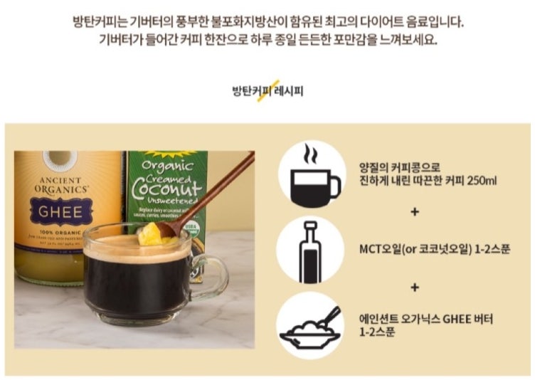 레시피는 놀라울 정도로 간단하다. 블랙커피 한 잔에 기버터 1큰술(약 15g)을 넣고, 가능하다면 MCT 오일 1큰술을 추가한다.